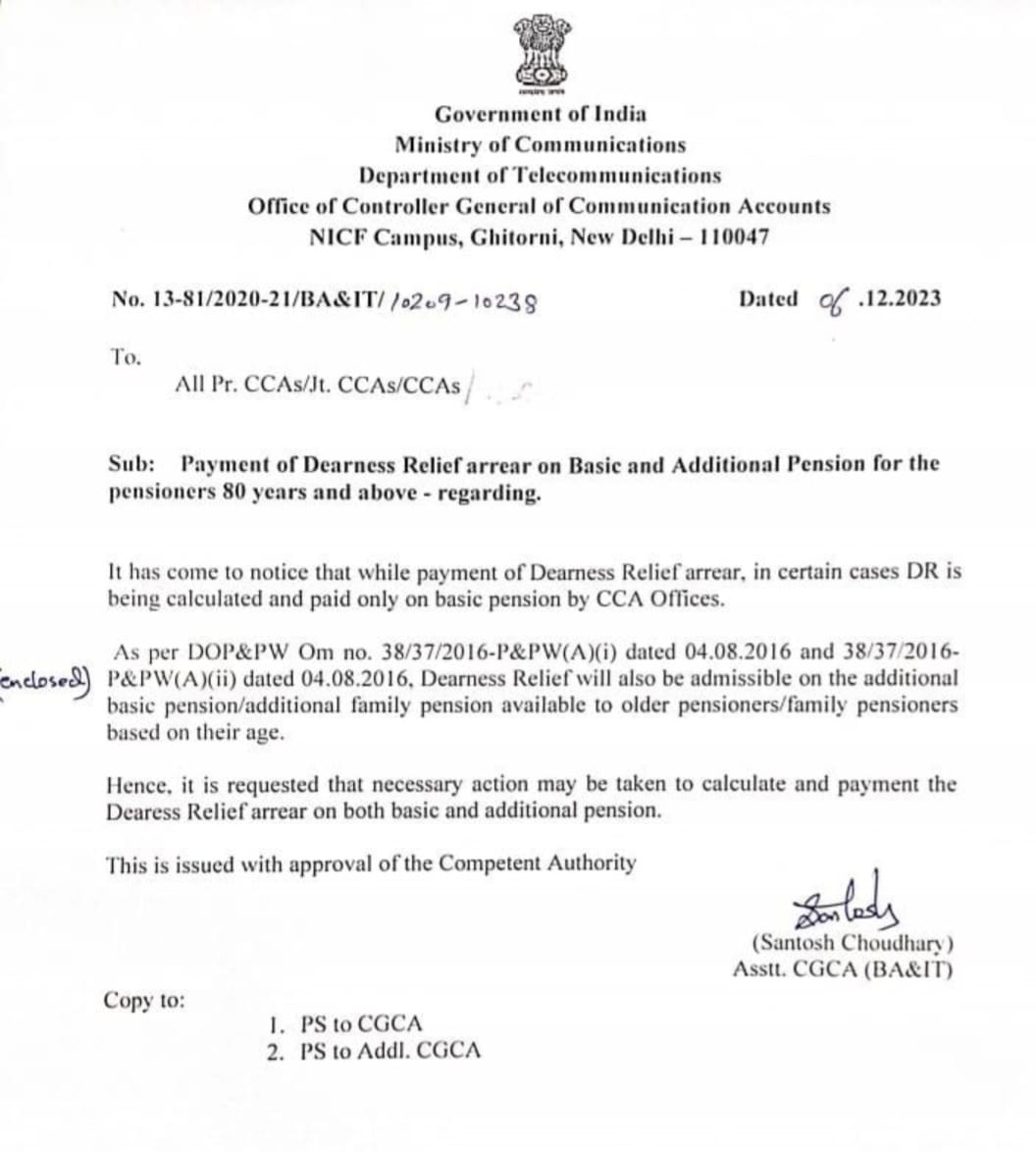 PAYMENT OF DEARNESS RELIEF ARREAR ON BASIC AND ADDITIONAL PENSION FOR PENSIONERS 80 YEARS AND ABOVE