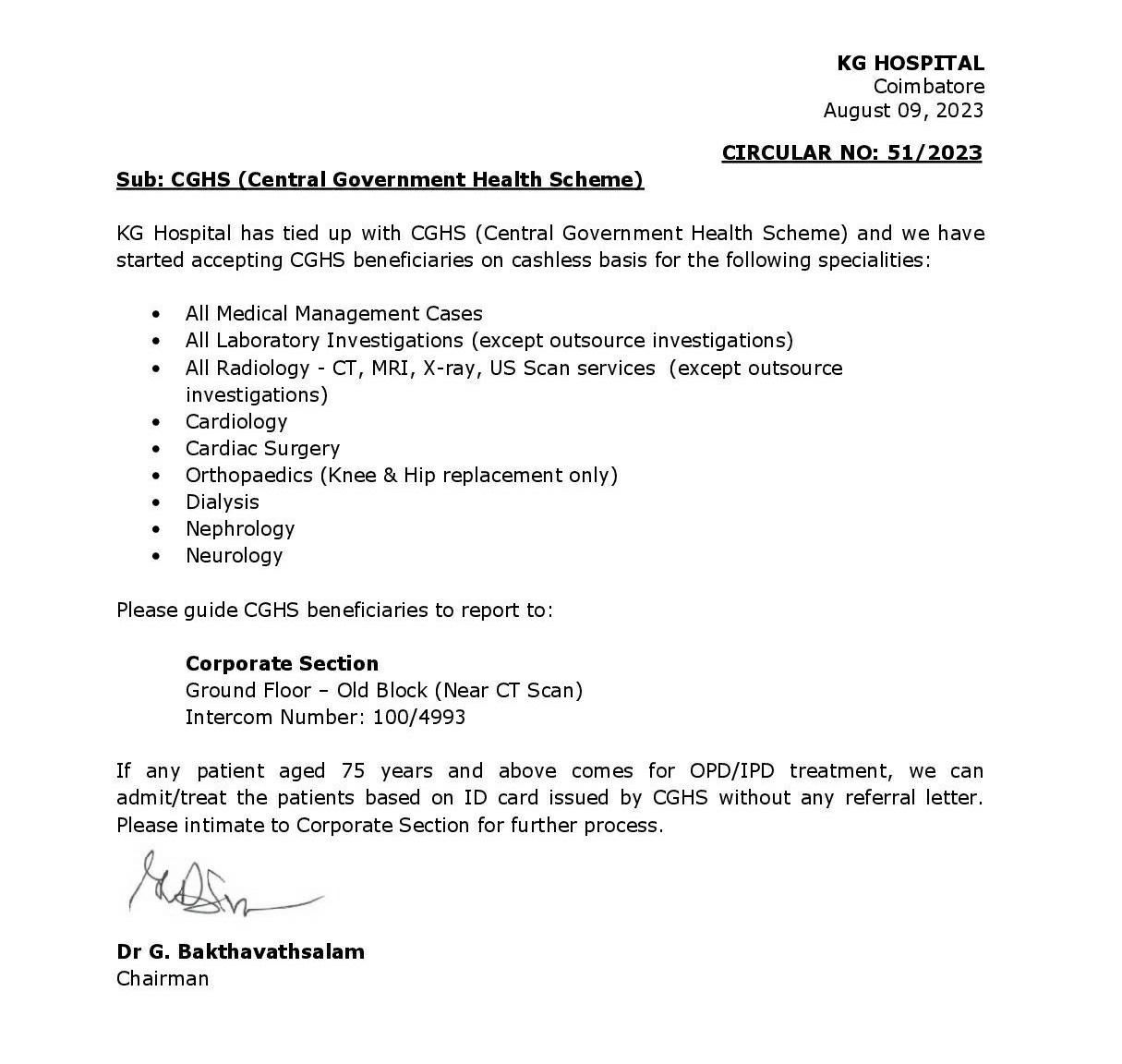 KG HOSPITAL, COIMBATORE TIED UP WITH CGHS
