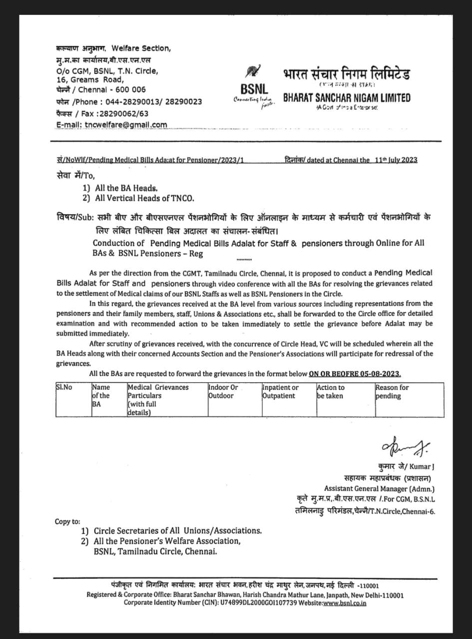 CONDUCT OF PENDING MEDICAL BILLS ADALAT FOR STAFF AND PENSIONERS THROUGH ONLINE FOR ALL BAs & BSNL PENSIONERS...