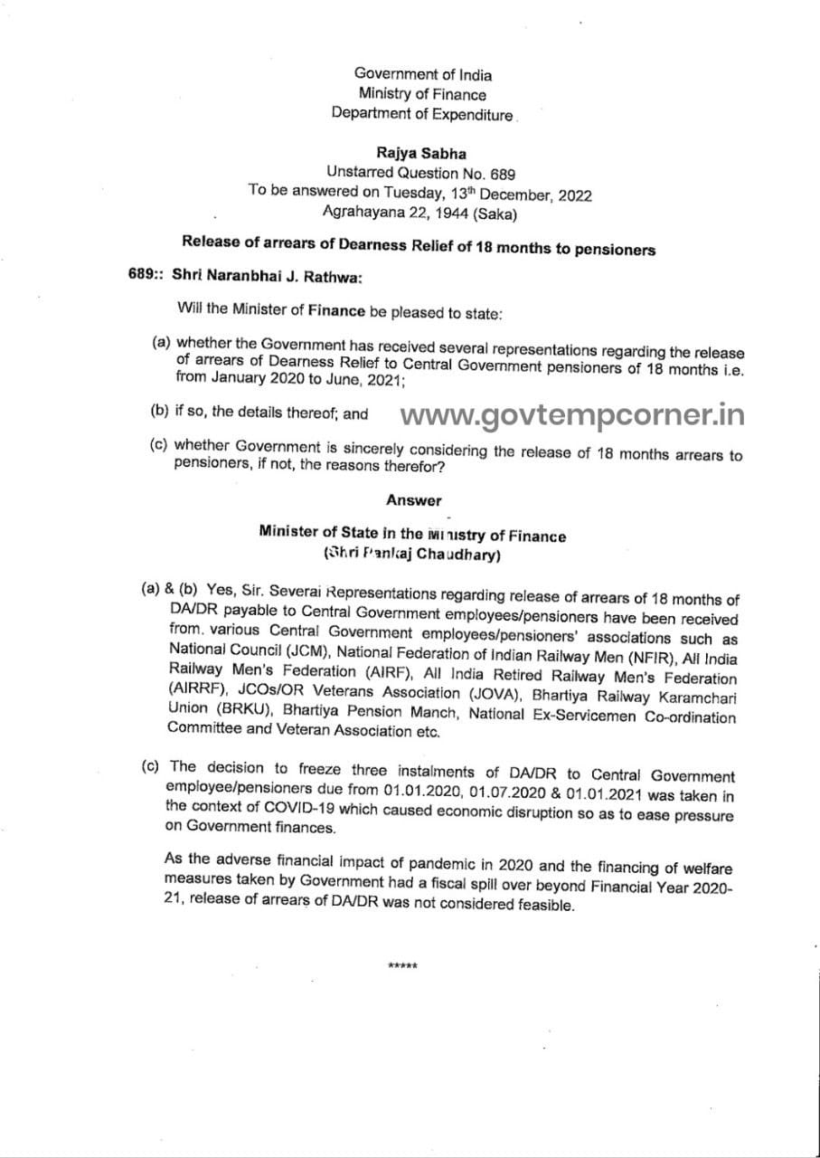 MINISTERS REPLY IN RAJYA SABHA TO UNSTARRED QUESTION IN CONNECTION WITH THE RELEASE OF IMPOUNDED DA FOR 18 MONTHS
